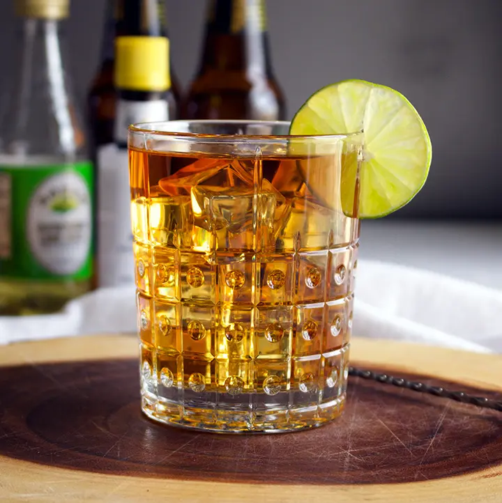 Налить бренди и имбирное в хайбол со льдом. Осторожно перемеать.