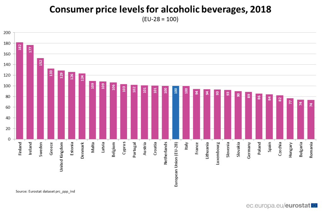 Евростат опубликовал последнее сравнение цен на алкоголь в странах Европы.